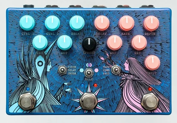 Dark Light is a dual reverb featuring both Dark Star and Sunlight. With all the routing options you could want, including separate stereo, parallel mono, and series mono, Dark Light takes Dark Star’s dark pitch shifted, delayed, and bit crushed reverb voices and Sunlight’s bright modulated, comb filtered, and bandpassed reverb voices and combines them into one massive sound to take your time and drift away in. Each pedal maintains its core sound and control set, then expands from there.
