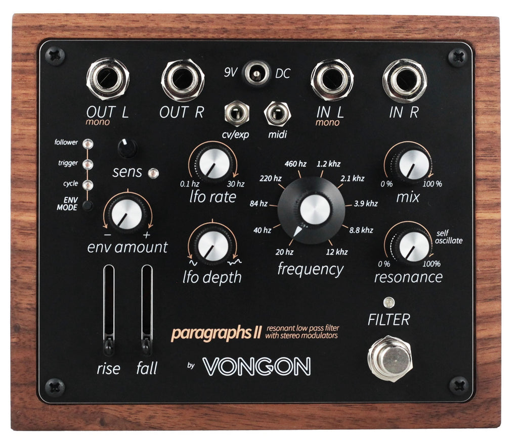 Paragraphs II is the latest generation of VONGON’s four-pole resonant low-pass filter effect. It now features stereo inputs and outputs, with a focus on modulation functions that respond to your playing dynamics and add stereo depth.