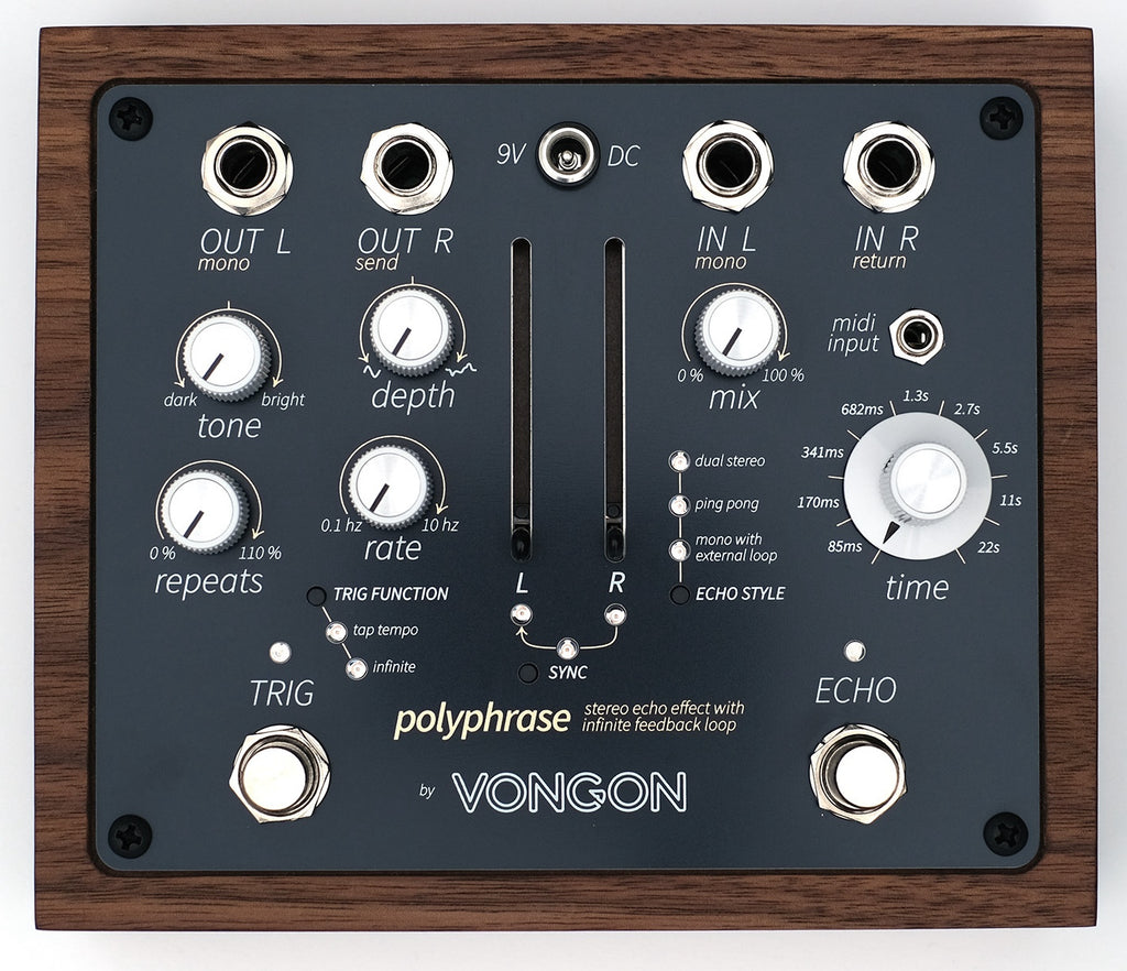 POLYPHRASE is a stereo echo and looping device inspired by early proto-digital delays of the 1970’s like the Lexicon Prime Time. As sophisticated as it is easy-to-use, Polyphrase is capable of everything from rich, dubby rhythmic repeats, to metallic resonant flanges. It is unique in being able to generate loops as long as 22 seconds, opening up a new palette of sonic possibilities for the avant-garde, ambient, or adventurous musician.