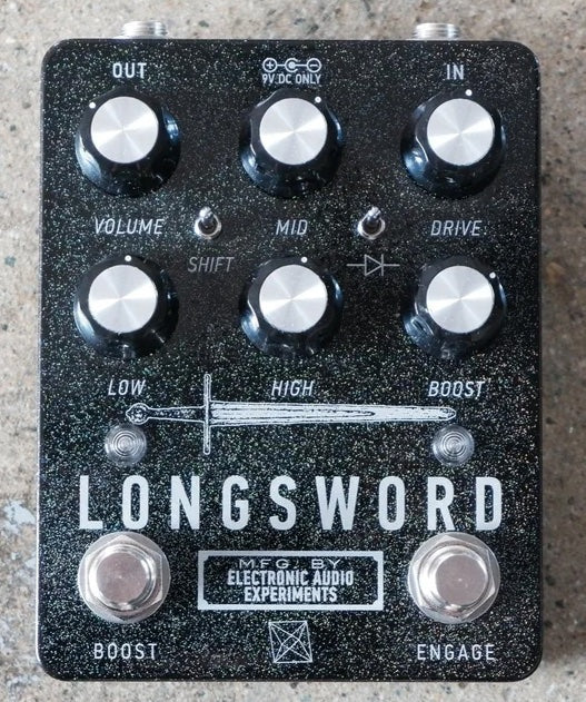 The Electronic Audio Experiments Longsword is yet another contender in the endless void of op-amp based drive pedals—familiar but with some novel twists. Cascaded gain stages allow for the full range from clean boost to massive distortion, all without sacrificing tonal flexibility. The equalizer combines bass and treble shelving filters with an active, frequency-selectable midrange boost/cut control. This lets the user sculpt a diverse array of tones and carve out a niche in even the most dense of mixes. The Longsword has a broad frequency response which makes it work equally well with guitar, baritone, and bass.